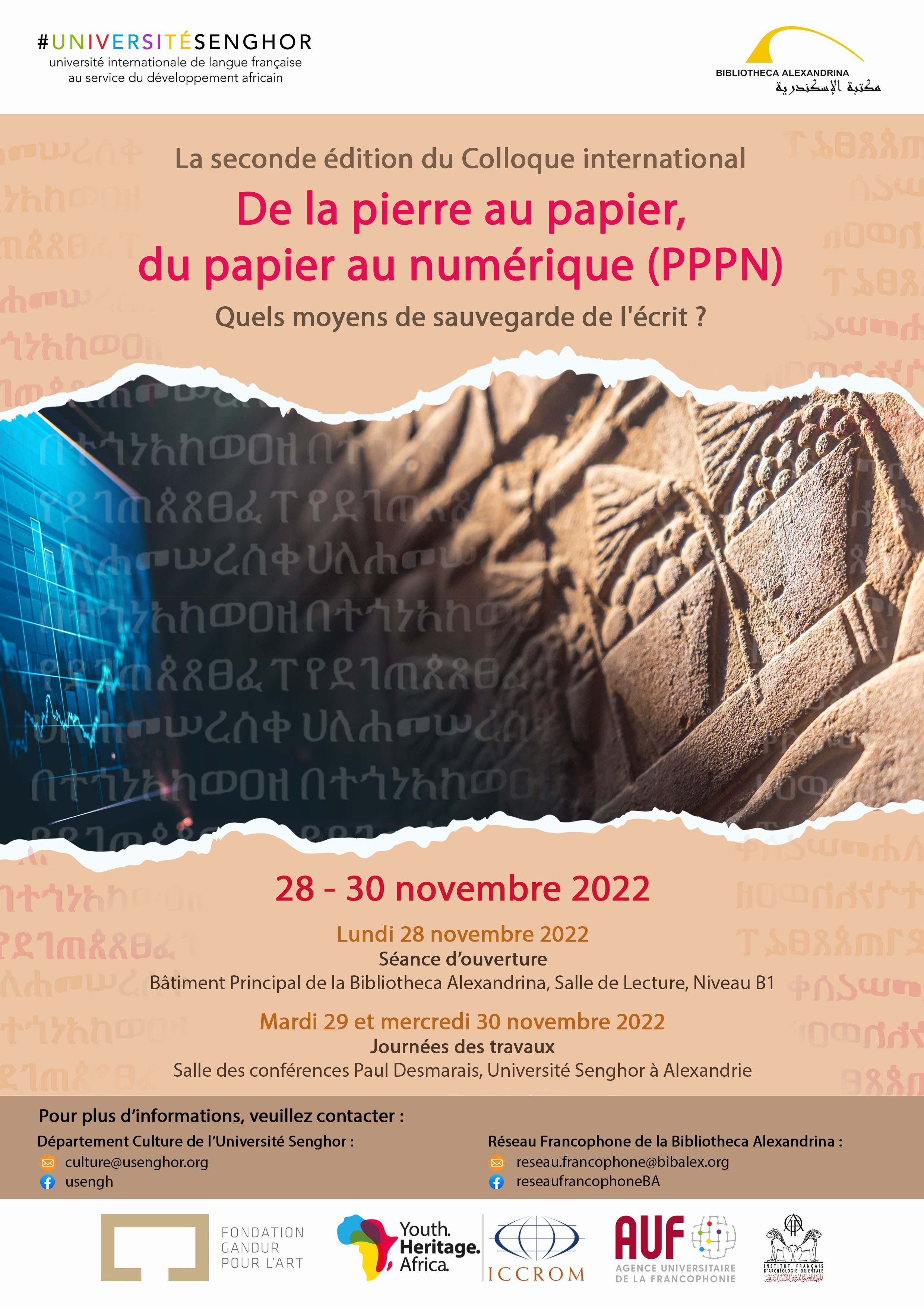 L'Université Senghor, en partenariat avec la Bibliotheca Alexandrina, organise, la seconde édition du Colloque international "De la pierre au papier, du papier au numérique” (PPPN2) avec le sous-thème : “Quels moyens de sauvegarde de l’écrit ?" du 28 au 30 novembre 2022.